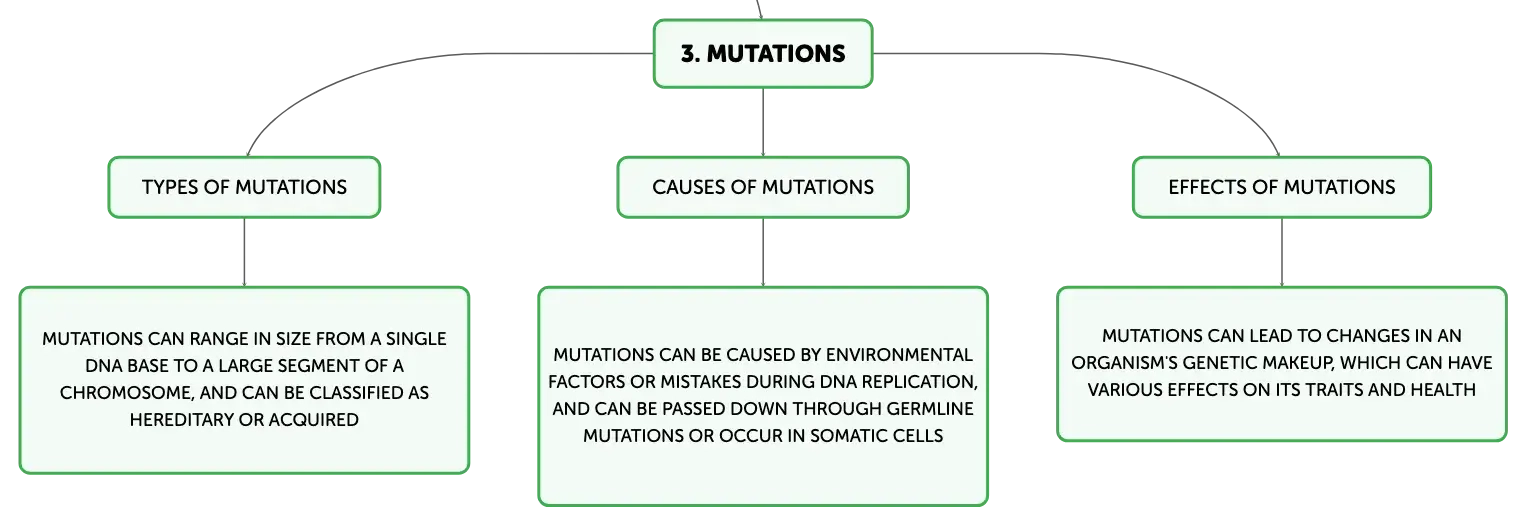 Mutations are permanent alterations in the DNA sequence that differ from the sequence found in most people. Mutations range in size from a single DNA building block (DNA base) to a large segment of a chromosome that includes multiple genes. Gene mutations can be classified in two major ways: hereditary mutations are inherited from a parent and are present throughout a person’s life in virtually every cell in the body. These mutations are also called germline mutations because they are present in the parent’s egg or sperm cells, which are the reproductive cells. Acquired (or somatic) mutations occur at some time during a person’s life and are present only in certain cells, not in every cell in the body. These changes can be caused by environmental factors such as ultraviolet radiation from the sun, or can occur if a mistake is made as DNA copies itself during cell division. Acquired mutations in somatic cells (cells other than sperm and egg cells) cannot be passed to the next generation. Genetic changes that are described as de novo (new) mutations can be either hereditary or somatic. In addition to small-scale mutations, such as those affecting a single gene, larger-scale mutations can involve the addition or loss of entire chromosomes or sets of chromosomes.Complementary Base Pairing: A Key Principle in DNA Structure and Sequencing