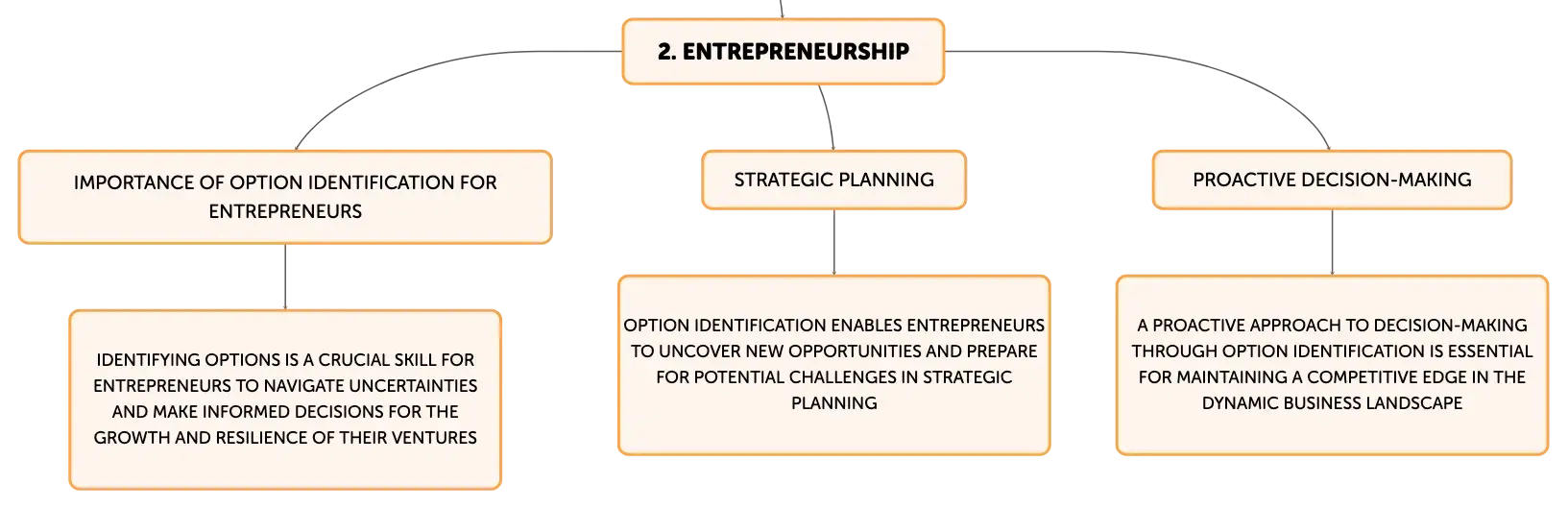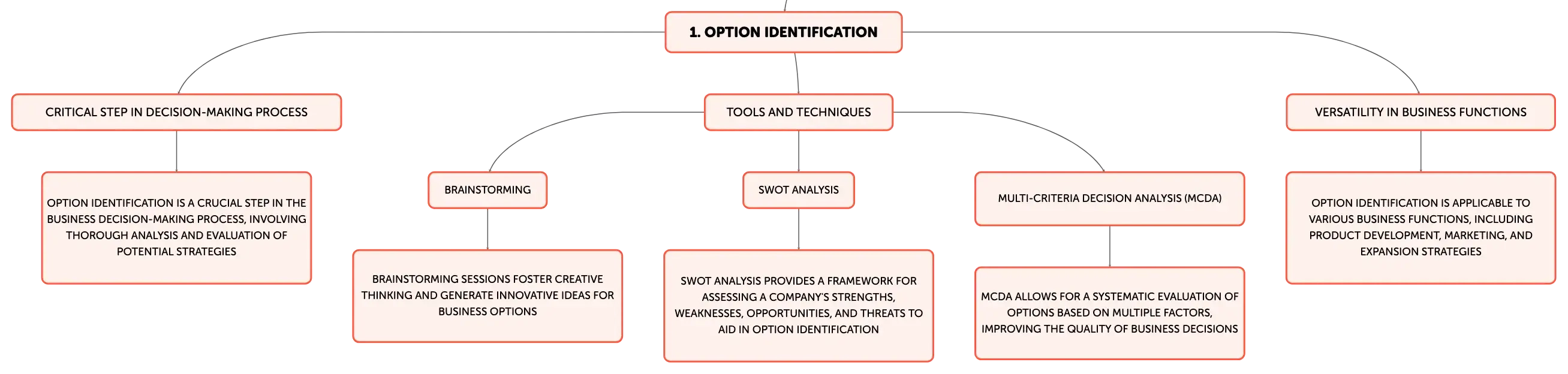 The main topic of the text is the significance of option identification in business decision-making. It highlights how this process aids in generating strategies to meet organizational goals, considering internal capabilities and market conditions. Entrepreneurs and businesses utilize various tools, such as SWOT Analysis and MCDA, to systematically explore alternatives across functions like product development, marketing, and finance, ensuring informed decisions and long-term prosperity.