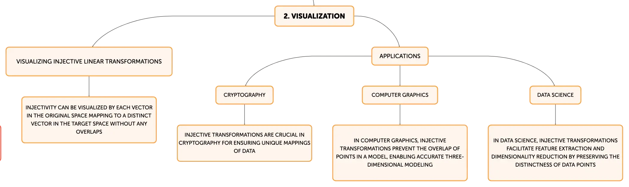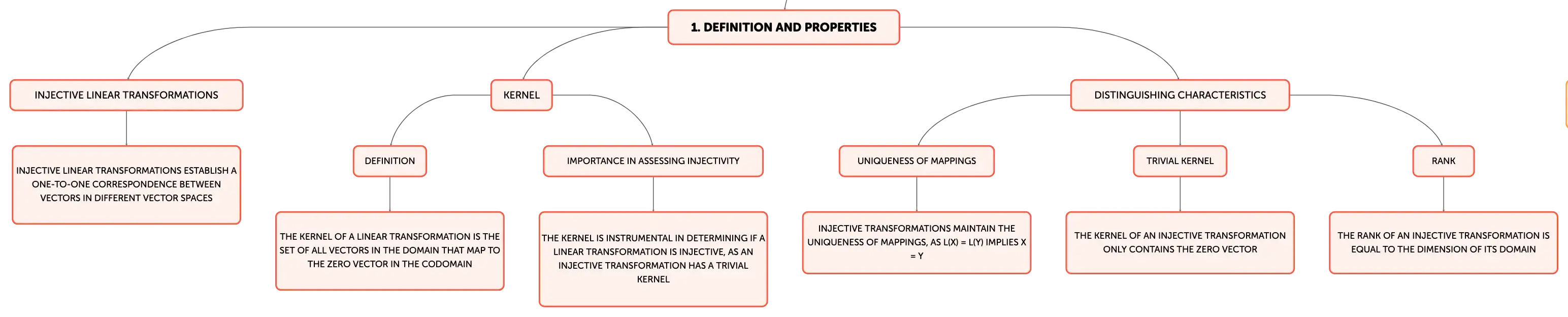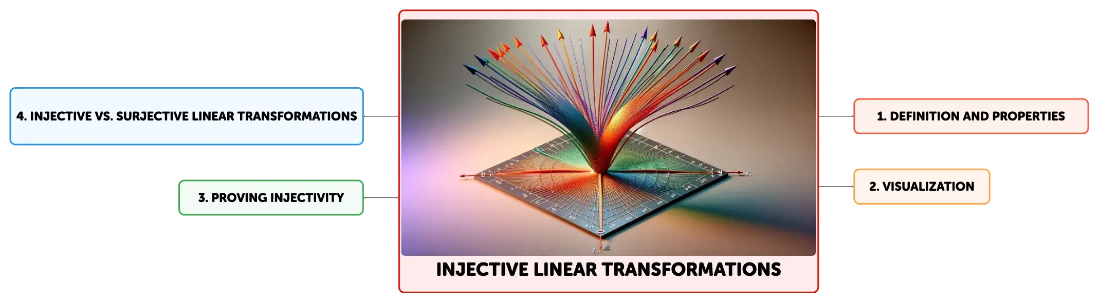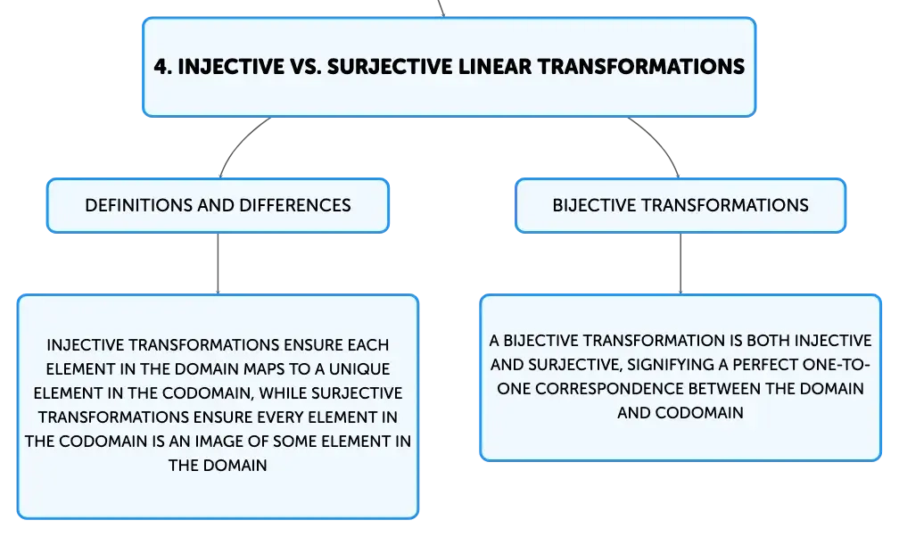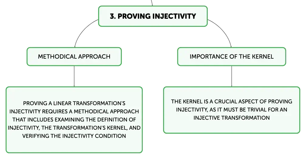 Injective linear transformations are fundamental in linear algebra, establishing one-to-one mappings between vectors in different spaces. They are characterized by a trivial kernel, maintaining the uniqueness and dimensionality of vector spaces. These transformations are crucial in fields like cryptography, computer graphics, and data science, where precise and distinct mappings are necessary for security, accurate modeling, and data analysis. Understanding injectivity is key to grasping the structure and function of linear transformations.