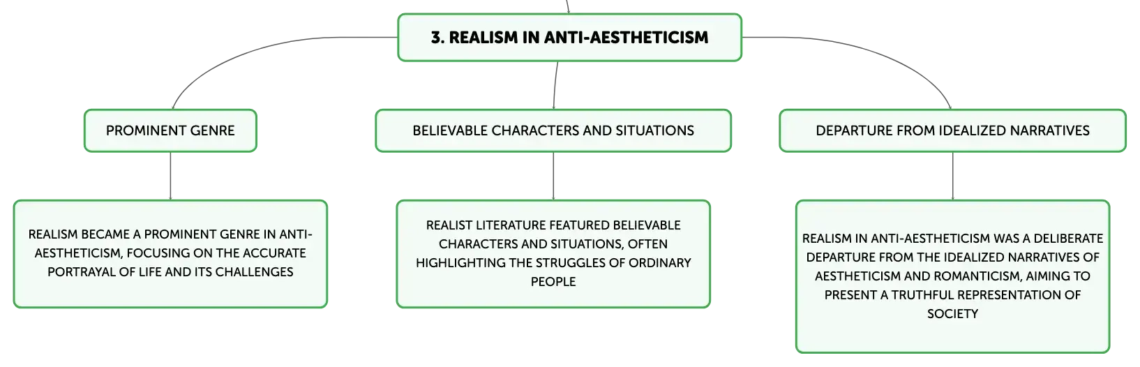Anti-Aestheticism emerged as a counter-movement to Aestheticism, advocating for art with a moral or social purpose. It favored realism and engagement with societal issues over the pursuit of beauty. Works like Arnold Bennett's 'Clayhanger' exemplify this trend, focusing on authentic depictions of life and its challenges, and addressing themes such as authority and women's rights.