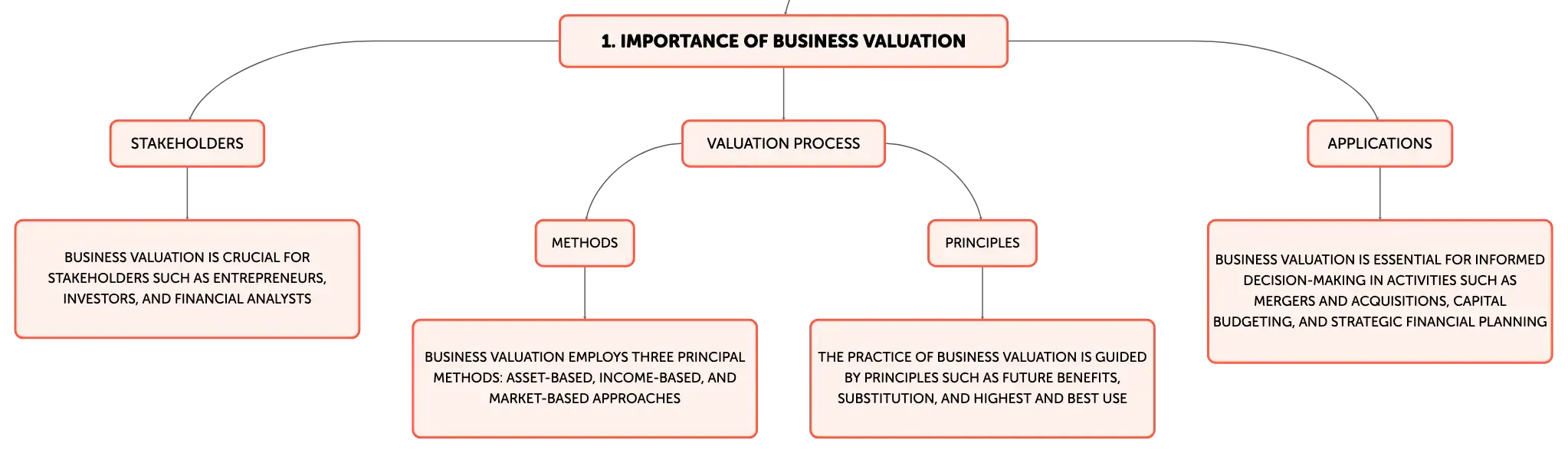 Business valuation is crucial in corporate finance, guiding stakeholders through mergers, acquisitions, and financial planning. It involves assessing a firm's economic value by examining financial statements, future earnings, and intangible assets. The text outlines three main valuation methods: Asset-Based, Income-Based, and Market-Based approaches, each with specific applications and calculations. It also discusses the principles and strategic importance of valuation in practice, alongside benchmarks like P/E ratio.
