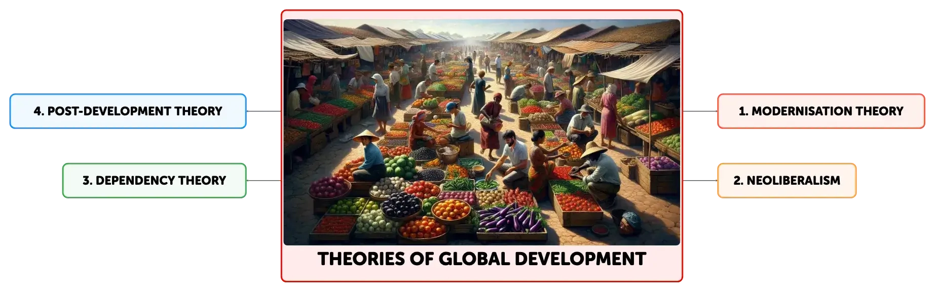 Global development theories like Modernisation, Dependency, World Systems, and Post-development offer insights into societal growth. They influence policy and address economic disparities, exploitation, and the need for culturally sensitive development models.