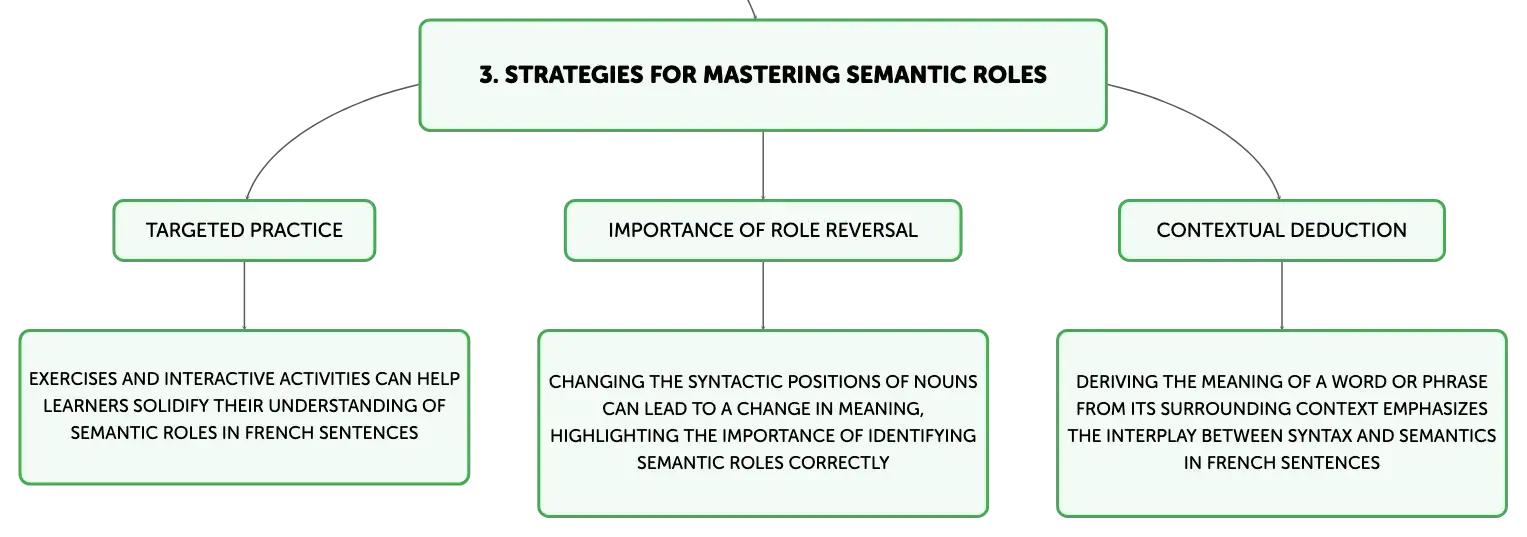 Semantic roles in French grammar, such as Agent, Theme, Goal, and others, are crucial for sentence construction and meaning. Understanding these roles helps learners parse sentences and express complex ideas. Strategies like role reversal and contextual deduction, along with practice, enhance grammatical precision and language proficiency.