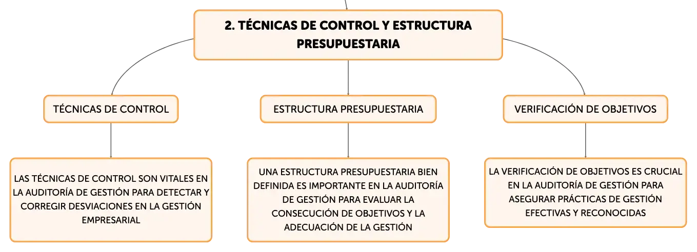 Las técnicas de control son vitales para detectar y corregir desviaciones en la gestión empresarial. Incluyen la implementación de sistemas de control interno, la evaluación de errores y el seguimiento de medidas correctivas. Una estructura presupuestaria bien definida es igualmente importante para una auditoría operativa eficaz, ya que proporciona información detallada y periódica a los responsables de cada área, facilitando la evaluación de la consecución de objetivos de manera económica y la adecuación de la gestión. La auditoría de gestión verifica la realización de objetivos, la identificación de alternativas más rentables y la correcta administración de los recursos empresariales.