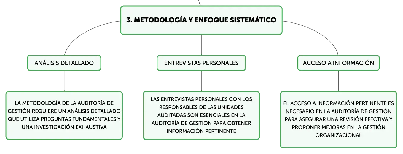 La metodología de la auditoría de gestión requiere un enfoque sistemático y meticuloso, aplicable a cualquier área o función sujeta a revisión. Este enfoque implica un análisis detallado que utiliza preguntas fundamentales como qué, cómo, cuándo y por qué, así como investigaciones exhaustivas que incluyen el estudio de los componentes del sector auditado, diagnóstico preciso, balance analítico y la formulación de soluciones. La auditoría de gestión se realiza a través de entrevistas personales con los responsables de las unidades auditadas y depende del acceso a información pertinente sobre el área en cuestión. Este proceso sistemático es imprescindible para asegurar una auditoría efectiva y para proponer mejoras significativas en la gestión organizacional.