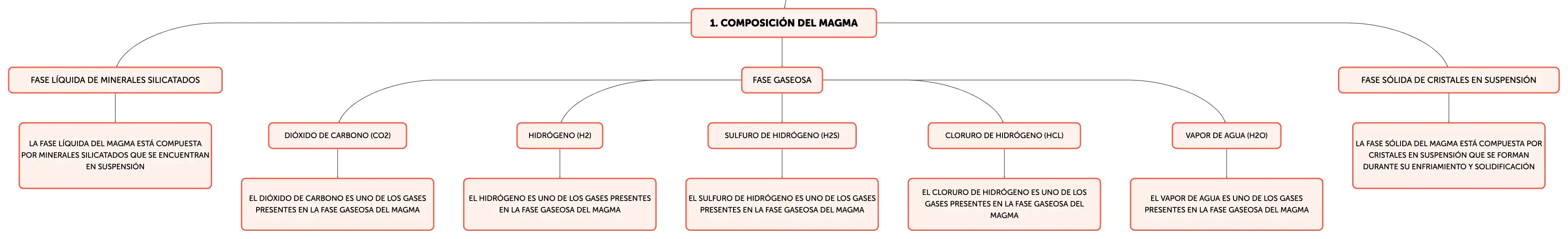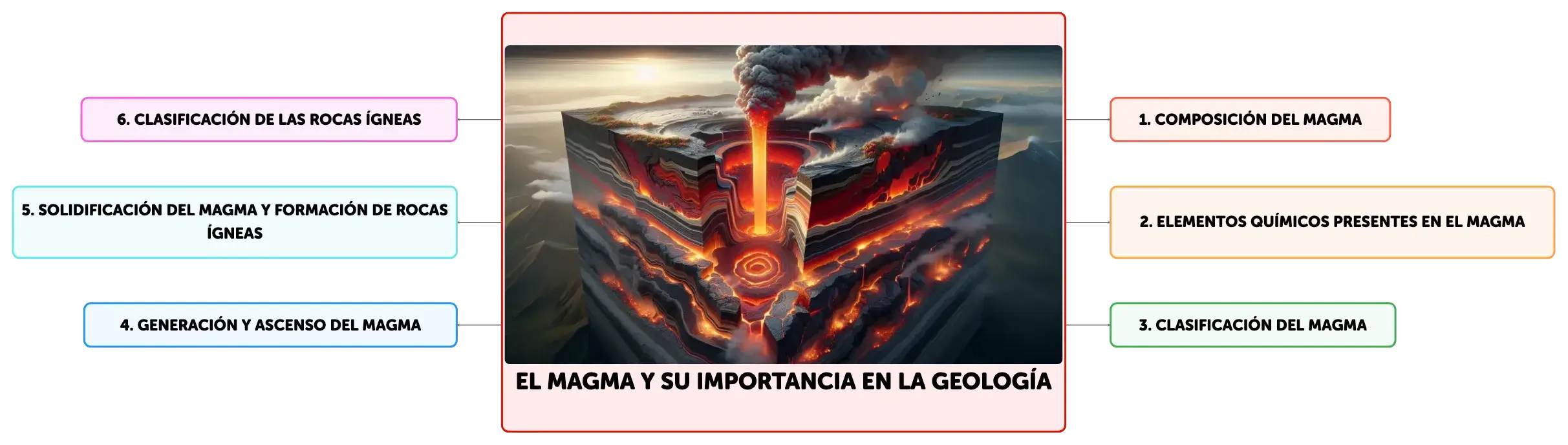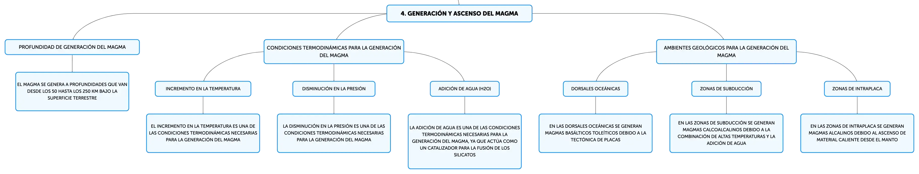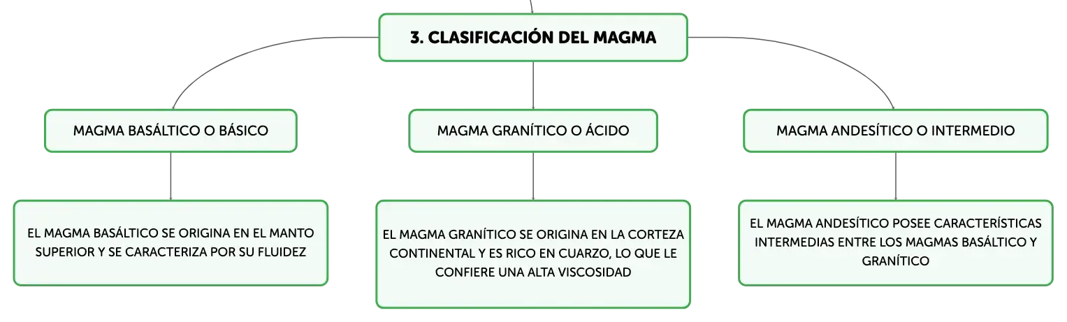 El magma, una mezcla incandescente de roca fundida en el interior terrestre, es clave en la formación de rocas ígneas y la actividad volcánica. Con temperaturas de 700 a 1200º C, su composición incluye minerales silicatados, gases y cristales. Los tipos de magma, basáltico, granítico y andesítico, se diferencian por su contenido de SiO2 y origen, influyendo en su viscosidad y movilidad. La solidificación del magma sigue las series de Bowen, resultando en una diversidad de texturas y composiciones de rocas ígneas, desde plutónicas a volcánicas.