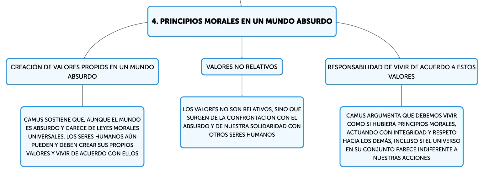 Camus sostiene que, aunque el mundo es absurdo y carece de leyes morales universales, los seres humanos aún pueden y deben crear sus propios valores y vivir de acuerdo con ellos