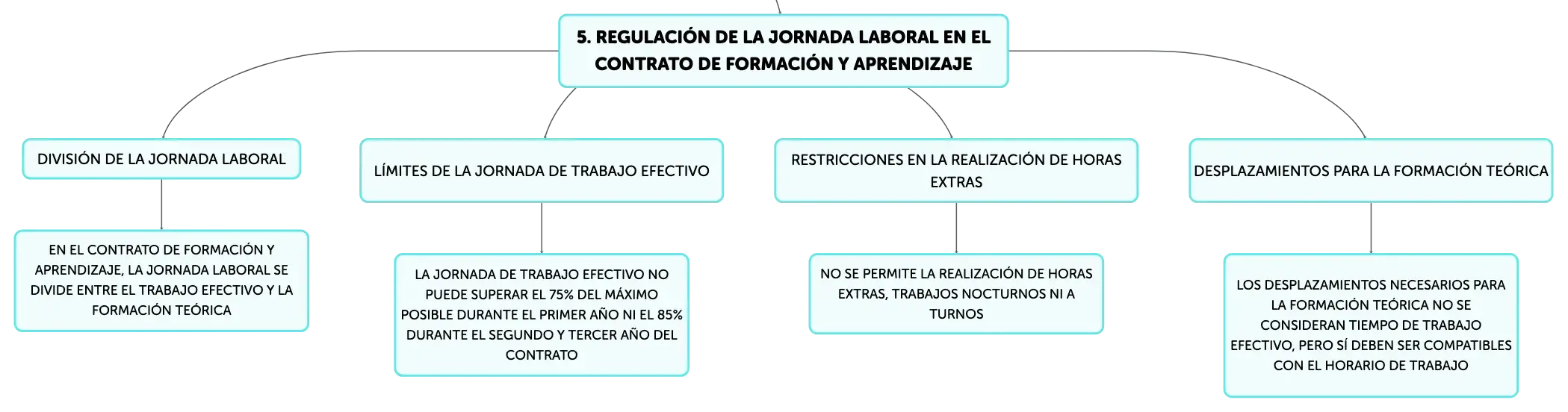 Para el segundo y tercer año del contrato de ______, el trabajo efectivo no debe sobrepasar el ______% de la jornada máxima. Además, no se admiten horas ______, trabajos ______ ni por ______.