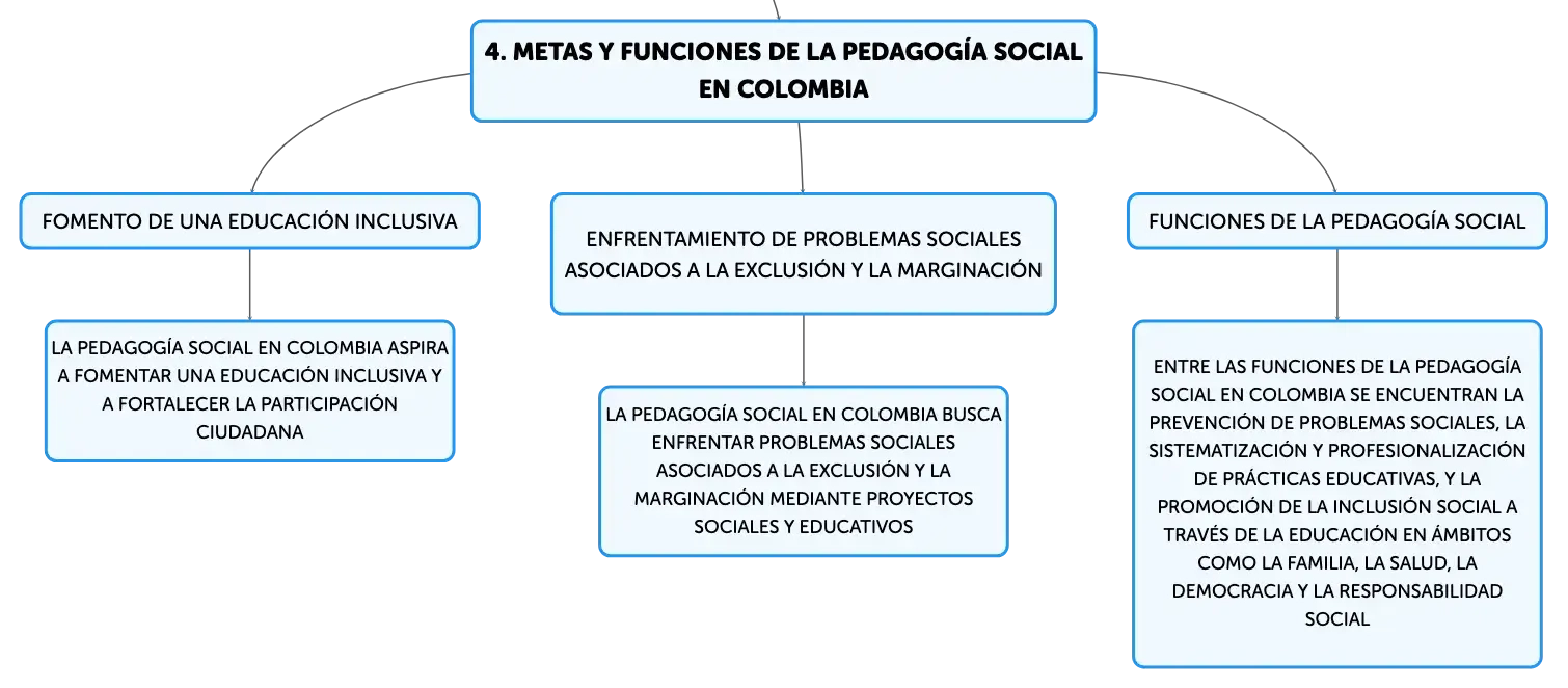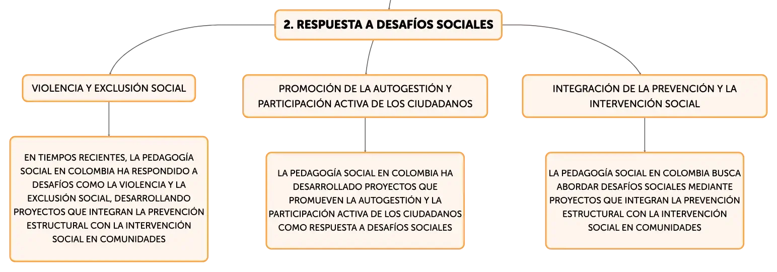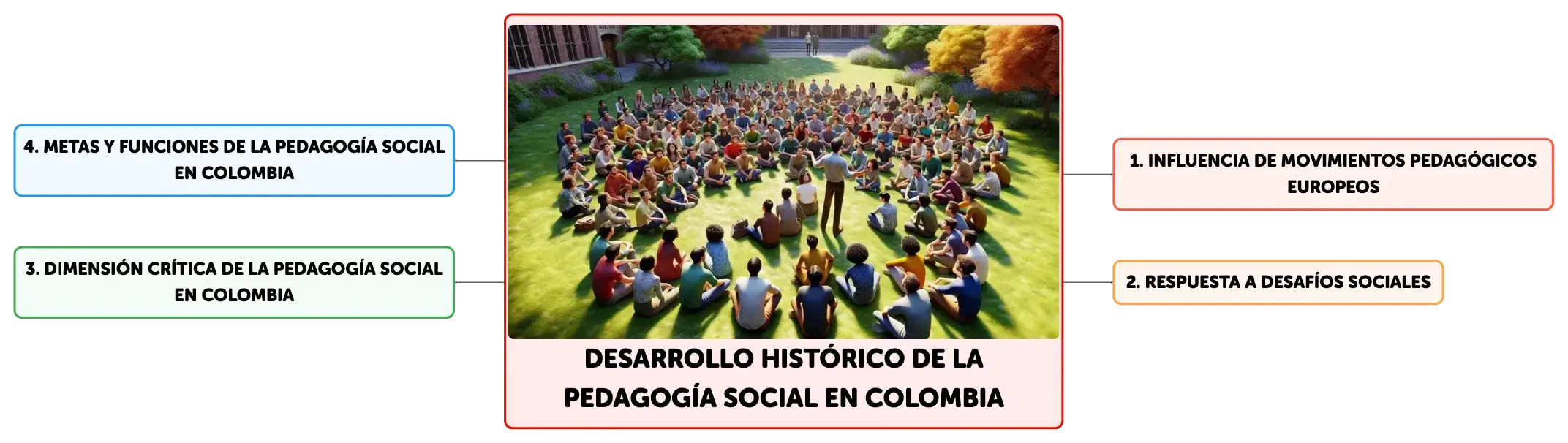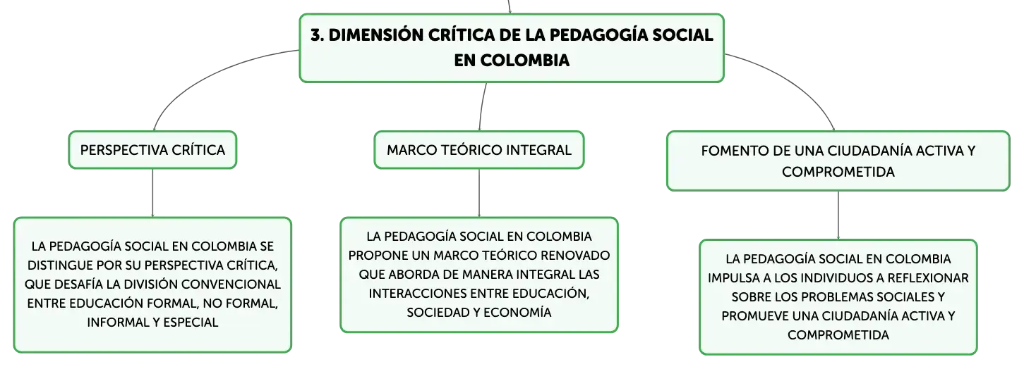 La Pedagogía Social en Colombia ha transitado desde su enfoque inicial en la educación de niños en pobreza hacia un reconocimiento profesional con programas académicos. Enfrenta desafíos como la violencia y exclusión, promoviendo la autogestión y participación ciudadana. Su dimensión crítica cuestiona la educación convencional y aboga por la inclusión y equidad social.