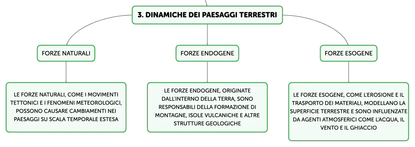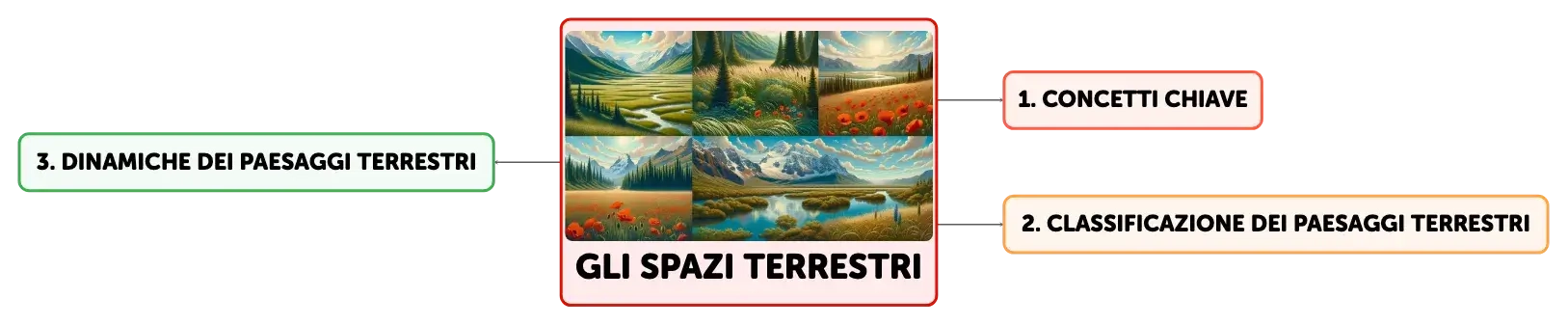Gli spazi terrestri sono modellati da forze endogene ed esogene, che influenzano ambiente, territorio e paesaggio. Questi elementi interagiscono definendo la geografia fisica e visiva della Terra, con una varietà di paesaggi naturali e antropizzati che riflettono l'interazione tra elementi naturali e l'impatto umano.